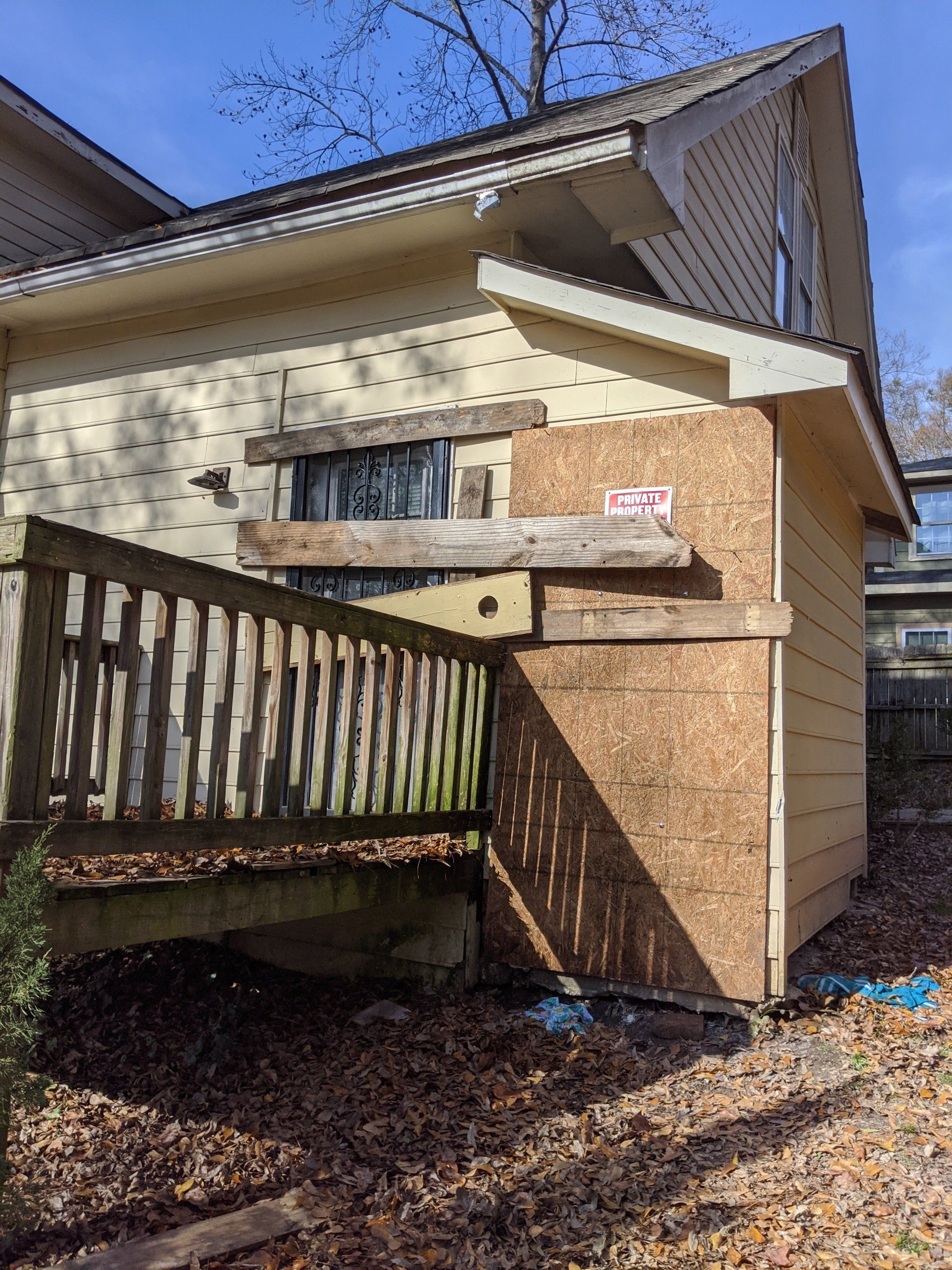 Seen in the below pictures, we are repairing the inside and outside of the house where the yard upkeep has fallen aside. In the pictures, you can observe that the yard and house exterior has been unattended for years. We have been contracted to improve this property and ensure that the yard and house exterior are maintained.